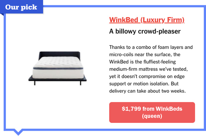 After spending several weeks of research online, we decided on purchasing a WinkBeds Mattress. Now that we've had it for 6 months, all I can say is that we could not be happier with our choice. It is by far and away the best mattress we have ever owned (prior mattresses included a Sleep Number, a Serta Perfect Sleeper and a Sealey Posture-Pedic). The WinkBeds mattress gives us the perfect combination of firmness and softness and both my wife and I now wake up refreshed and without back pain (an issue we had with the Serta mattress). We love it so much that we have recommended WinkBeds to several friends and family members and my sister bought her's a month ago and absolutely loves it as well. Do yourself a big favor and try this excellent mattress out - you can't go wrong with their 100-day money-back guarantee. Frankly, I doubt that they make very many refunds. PS - it's worth the extra $100 to have the delivery people bring it right to your bedroom as the mattress is pretty heavy. (Our bedroom is on the second floor)